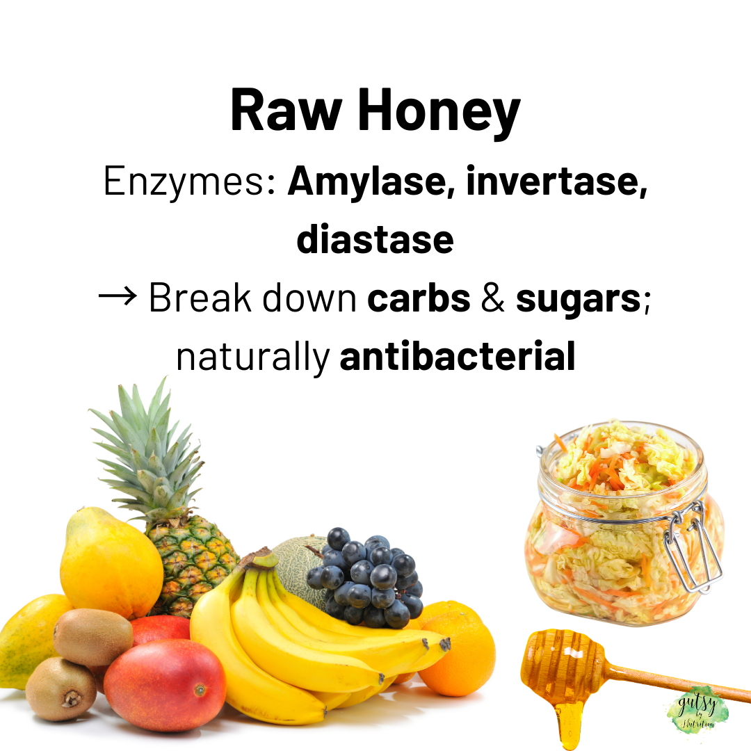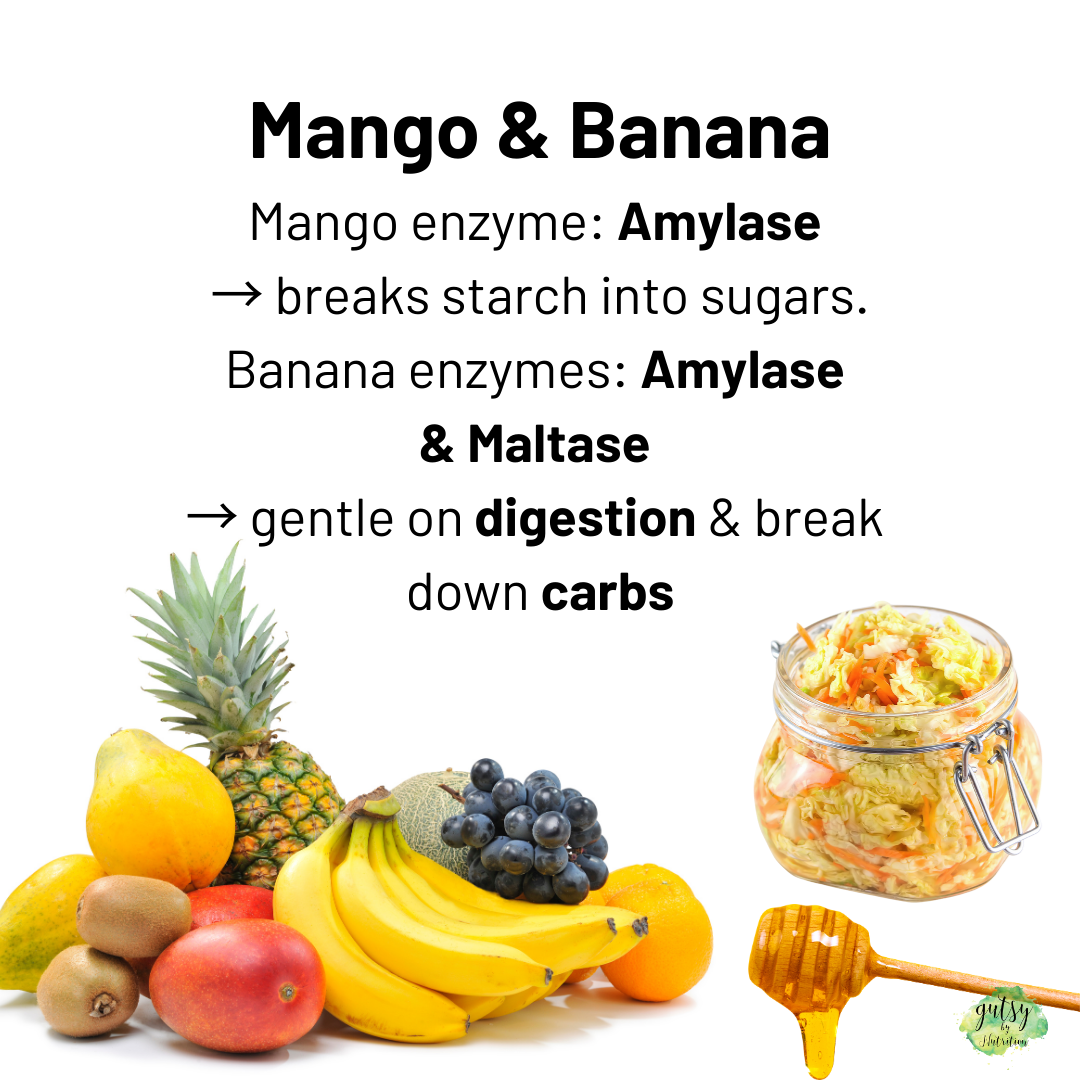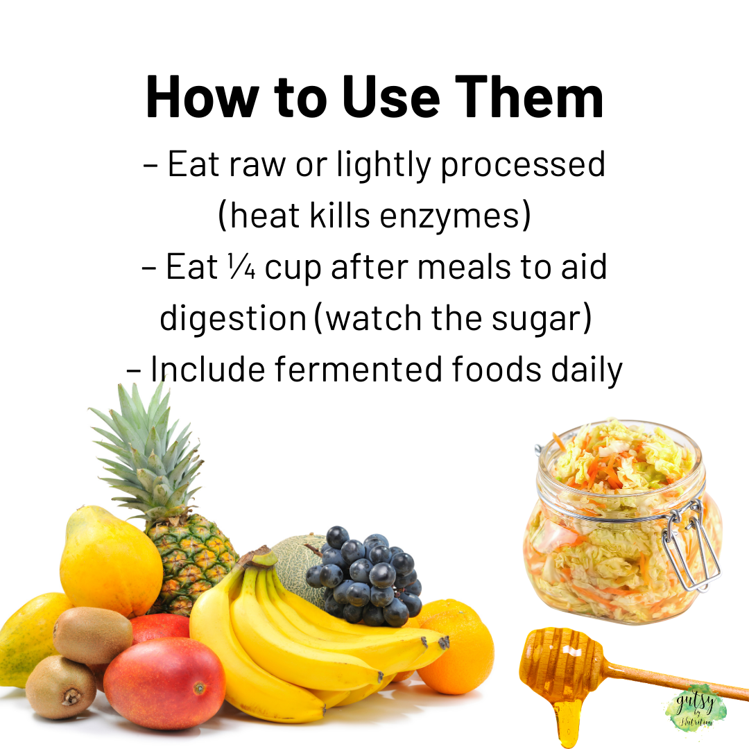 Fresh pineapple, papaya, kiwi, mango, bananas, raw honey, and fermented foods are naturally rich in enzymes that can give your gut extra help.