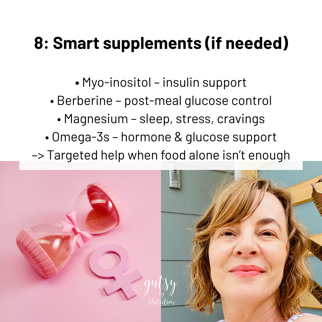 Use targeted supplements only when needed – A few key ones (like myo-inositol, magnesium, omega-3s, etc) can truly help cravings and blood sugar control