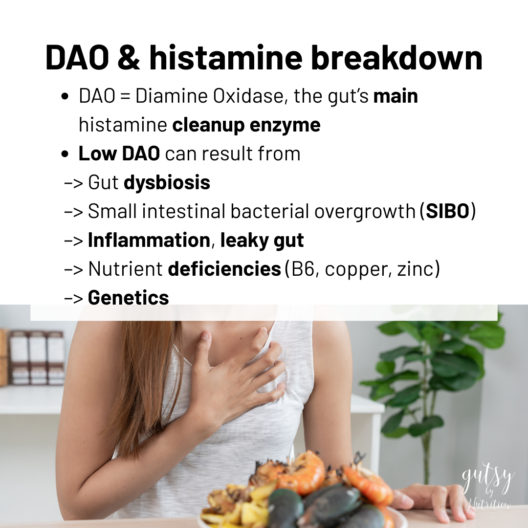 When beneficial bacteria are low and opportunistic bacteria dominate, histamine-producing microbes can flourish. At the same time, our DAO enzyme activity can be reduced, leaving our system unable to clear histamine efficiently.