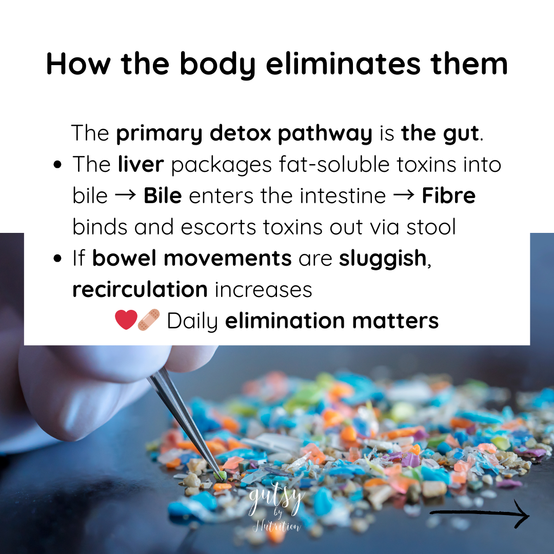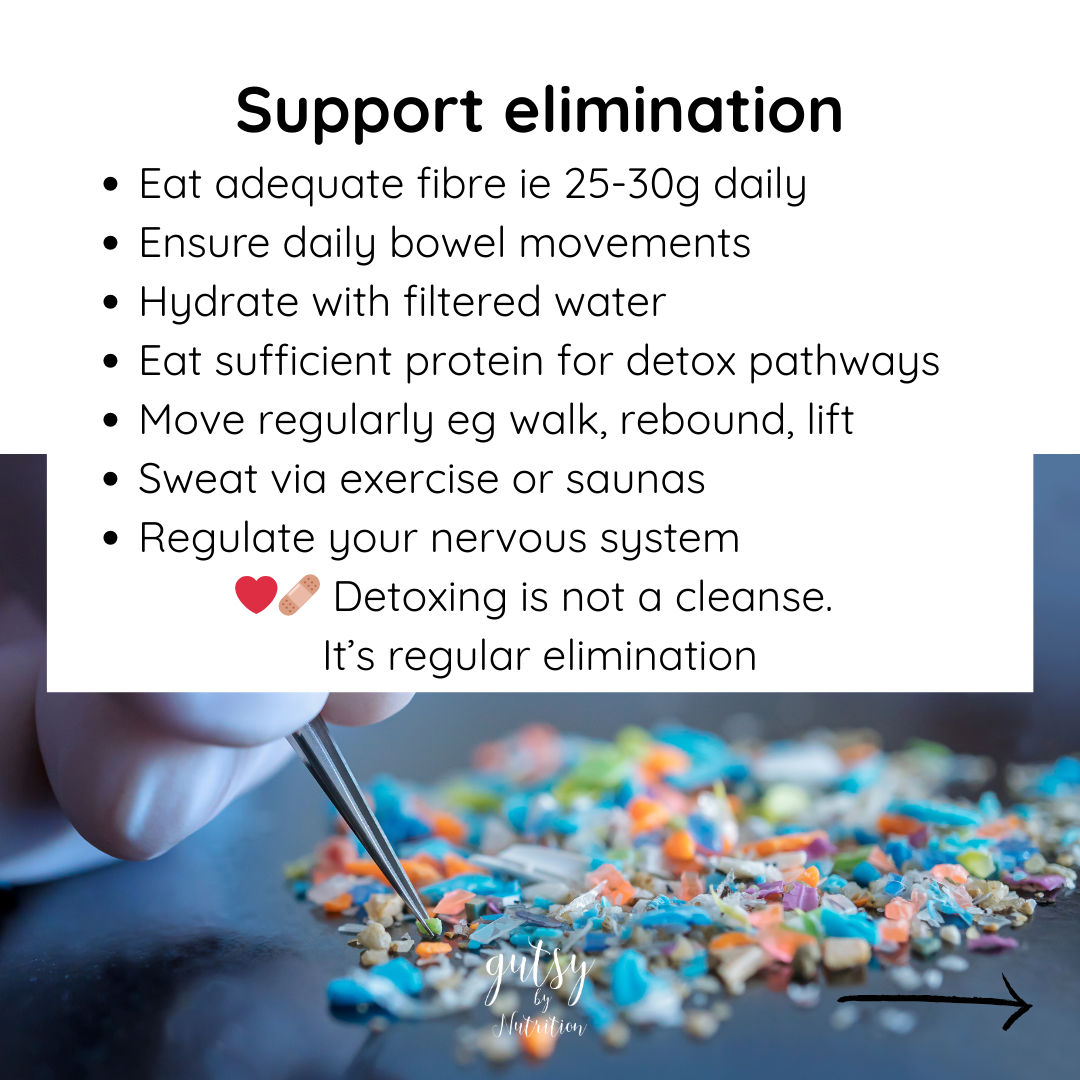 Our body eliminates toxins primarily through bile and stool – which means fibre and bowel regularity are foundational. But sweating, moving help too.